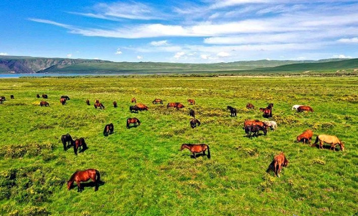 夏天,山丹马场迎来了它最热闹的时刻。草原变得郁郁葱葱,犹如一块巨大的绿色绒毯,无边无际地铺展开来。湛蓝的天空中飘着洁白的云朵,与碧绿的草原相互映衬,构成了一幅绝美的画卷。成群的牛羊在草原上悠然自得地吃草,骏马在草原上尽情奔腾,嘶鸣声回荡在天地之间。夏季丰富的植被为众多野生动物提供了充足的食物和栖息之所,鸟类在空中翱翔,野兔在草丛中穿梭,整个马场呈现出一片生机勃勃的景象。