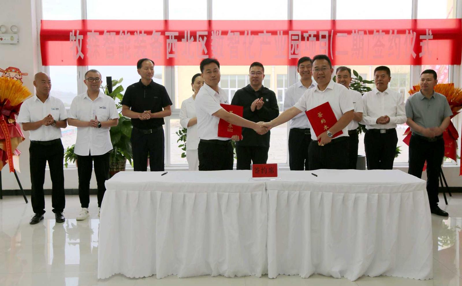 仪式前,参加领导现场听取了解项目建设情况,并对加快推动项目建设提出了具体要求。仪式后,还举行了牧森智能装备西北区数智化产业园项目(二期)签约仪式。二期计划投资20亿元,根据具体产业战略,建设占地500亩的数智化产业园1处,新建厂房、办公楼、购置安装相关设备。
