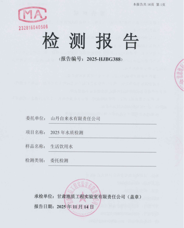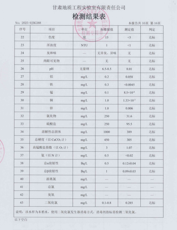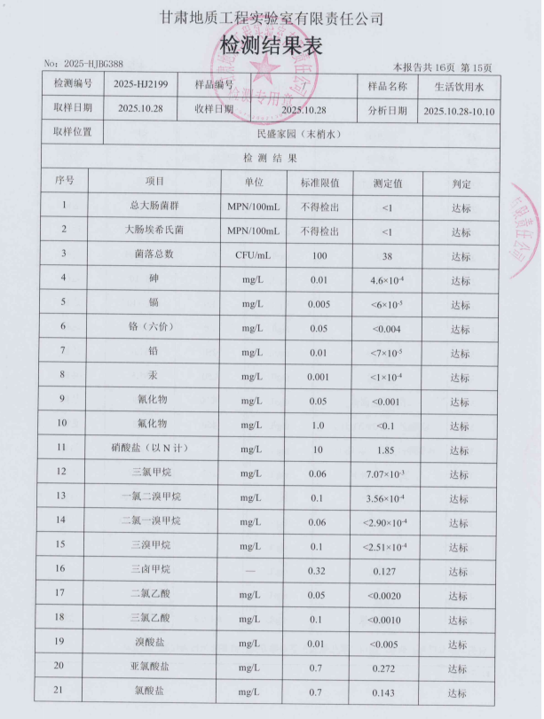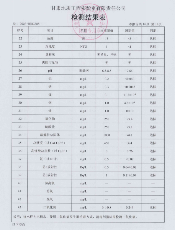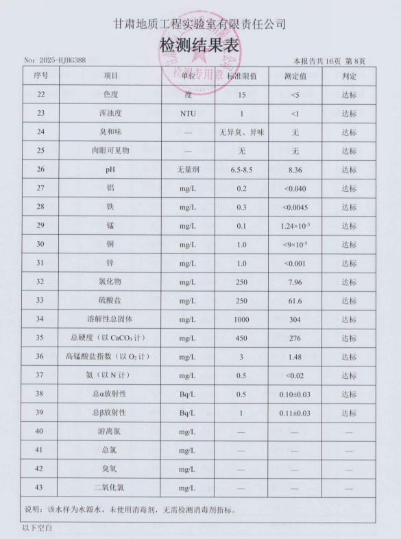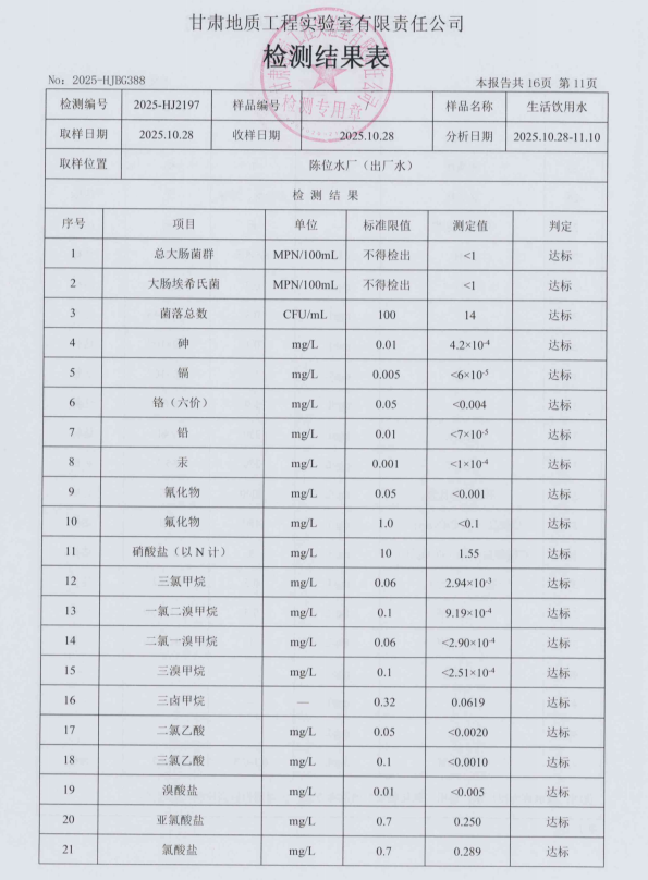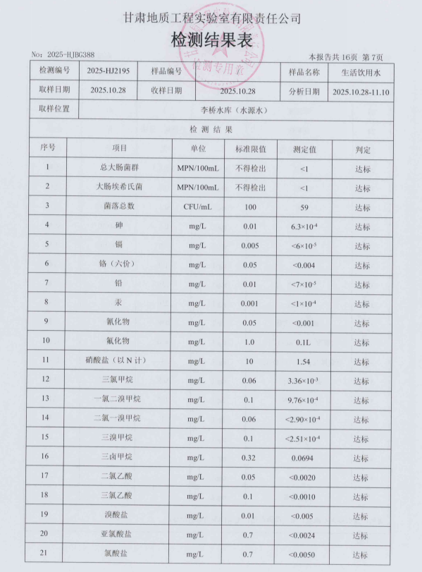 现将2025年第四季度生活饮用水水质检测信息公开如下:
