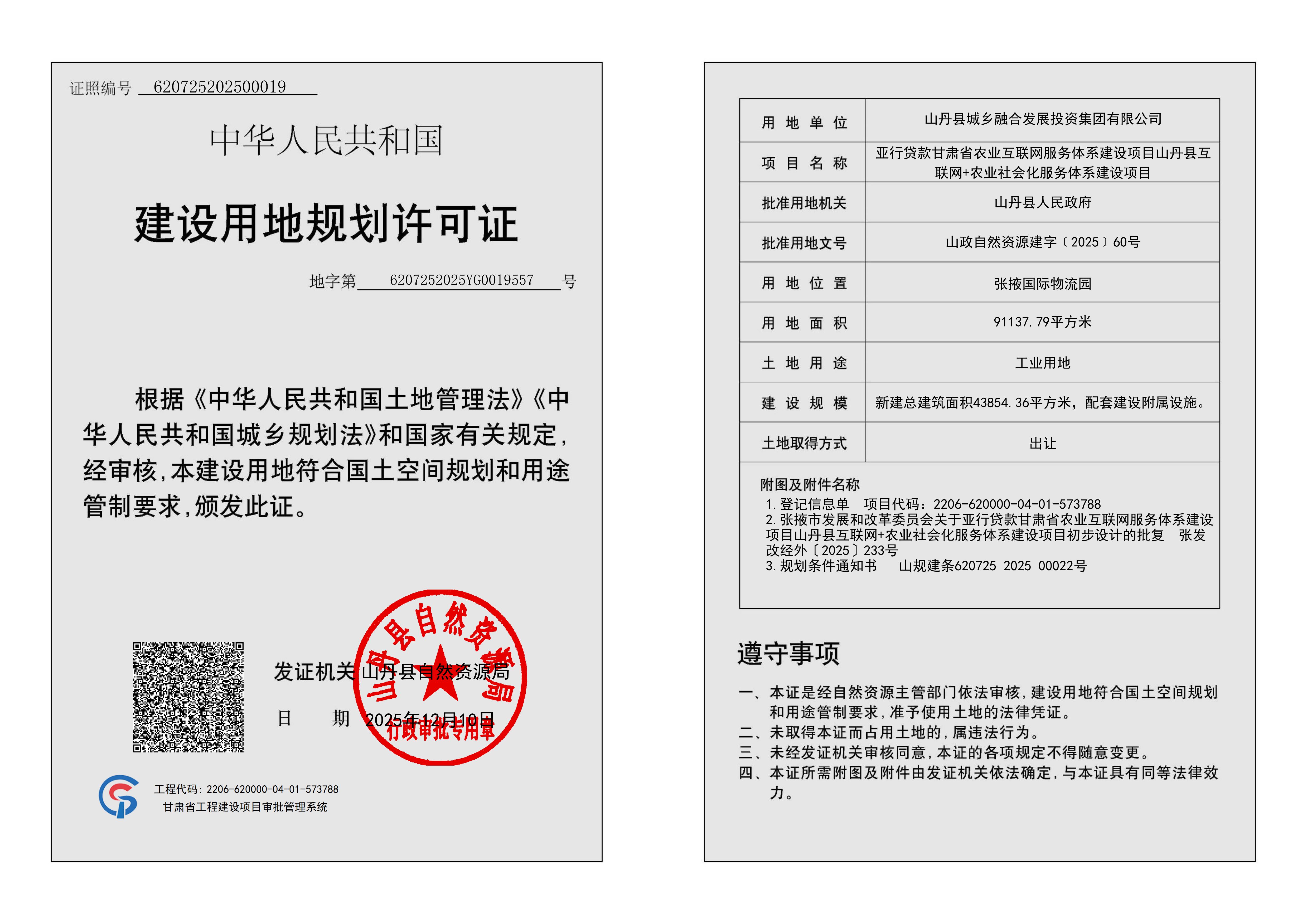 亚行贷款甘肃省农业互联网服务体系建设项目山丹县互联网+农业社会化服务体系建设项目建设用地规划许可证