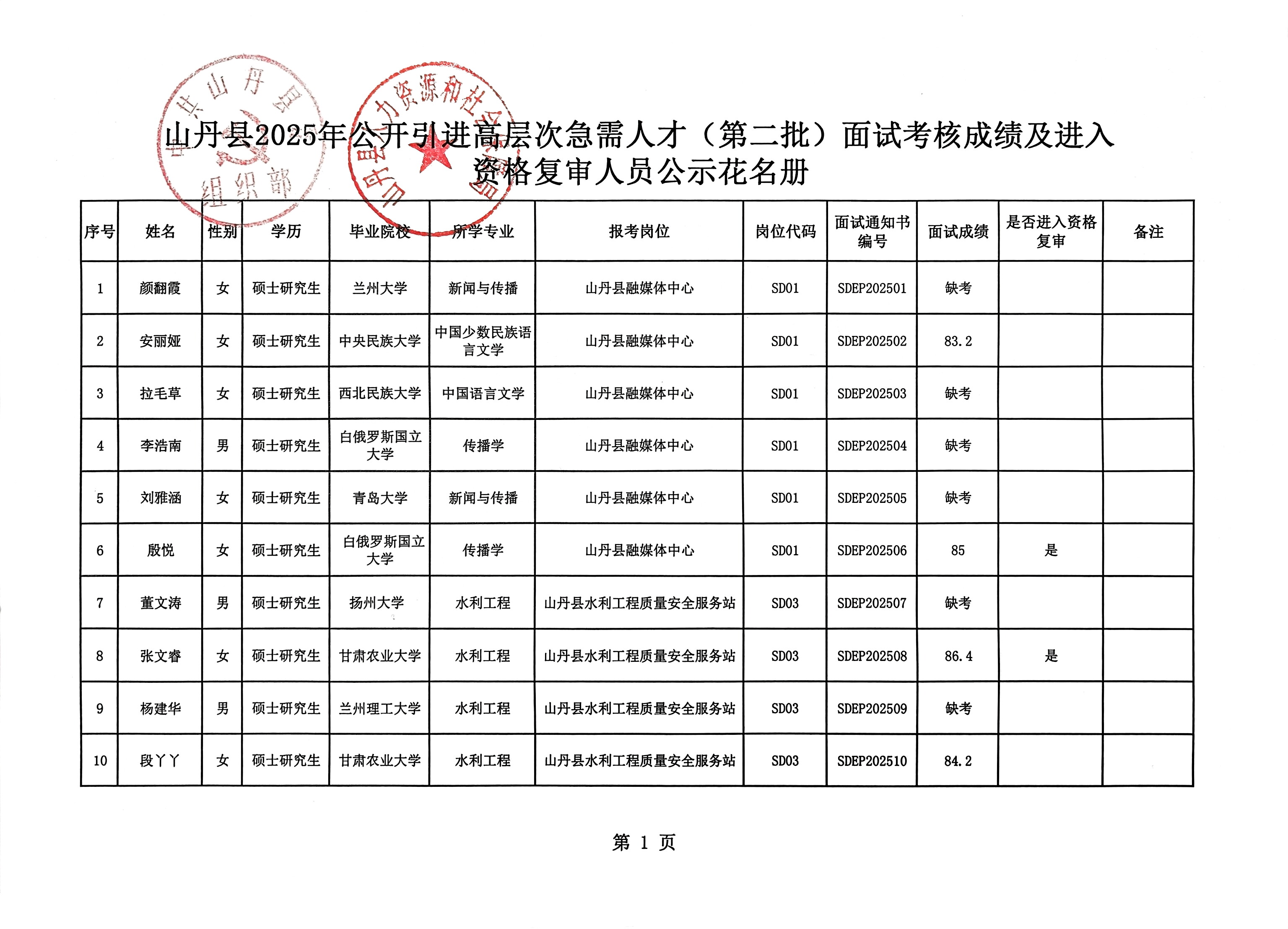 关于山丹县2025年公开引进高层次急需人才(第二批)面试考核成绩及进入资格复审人员的公告