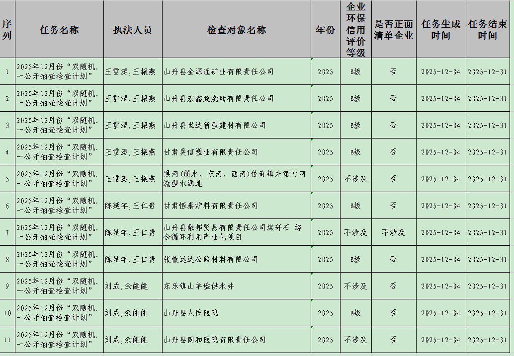 张掖市生态环境局山丹分局2025年12月份“双随机、一公开”抽查检查名单公示