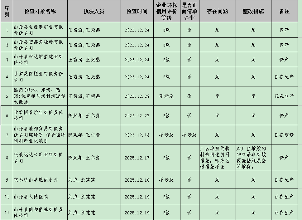 张掖市生态环境局山丹分局2025年12月份“双随机、一公开”现场检查情况公示