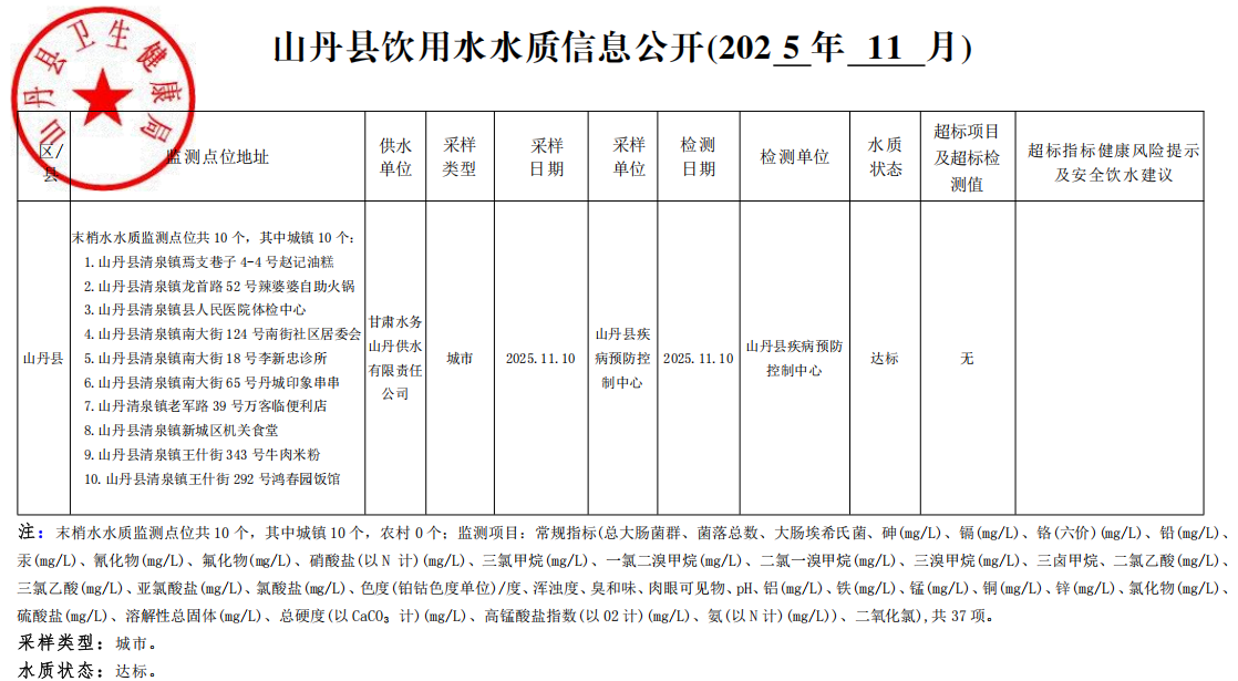 山丹县卫生健康局2025年饮用水水质信息11月份结果公示