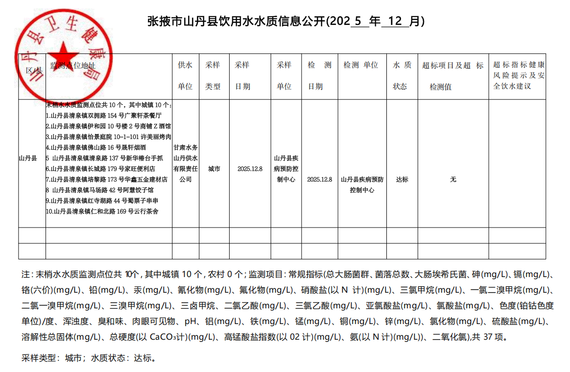 山丹县卫生健康局2025年饮用水水质信息12月份结果公示