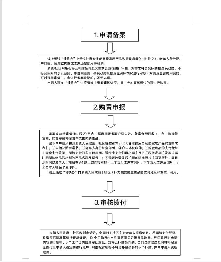 1.申请备案。通过“甘快办”上传《甘肃省适老智能家居产品购置需求表》(附件2)、老年人身份证、户口簿、房屋结构图或场景照片等材料,乡镇人民政府对是否符合补贴条件及其需求合理性进行审核,3个工作日内出具意见,对需求符合实际的报县民政局,不符合实际的予以驳回,并说明原因;县民政局根据资金实际,原则上2个工作日内出具备案意见(对因资金暂时用完的,可以延期出具意见),确保补贴资金使用精准、高效。