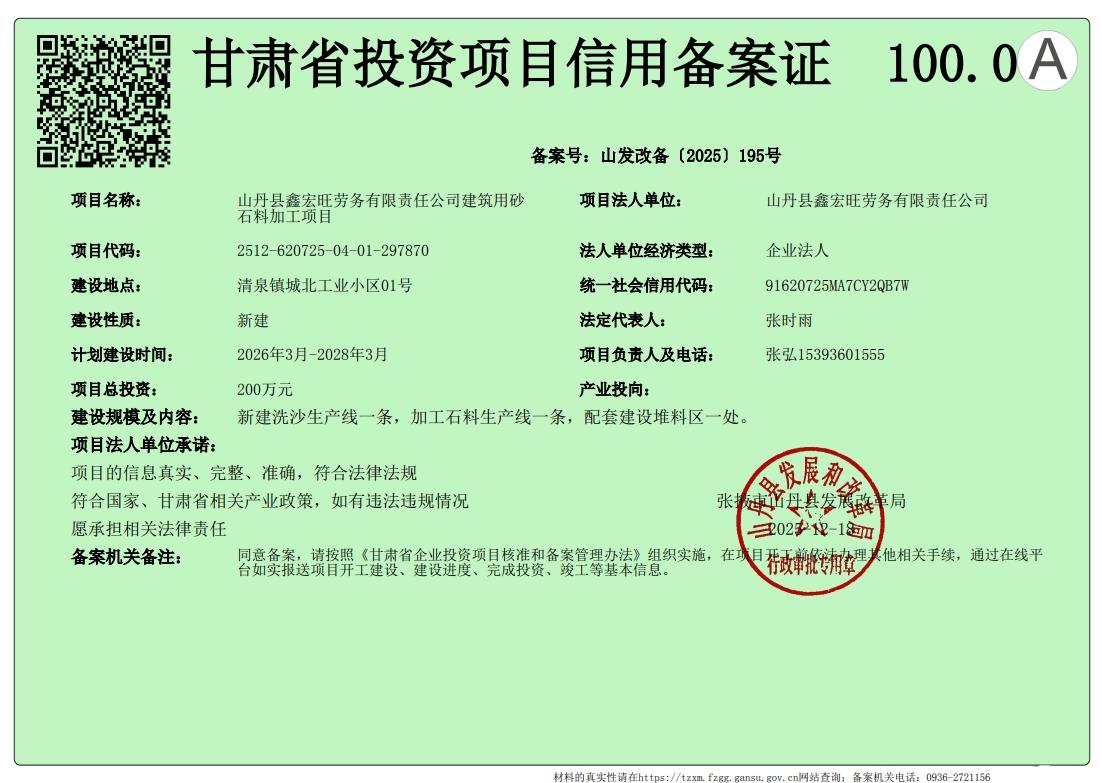 山丹县鑫宏旺劳务有限责任公司建筑用砂石料加工项目