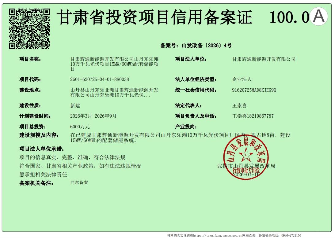 甘肃辉通新能源开发有限公司山丹东乐滩10万千瓦光伏项目15MW/60MWh配套储能项目