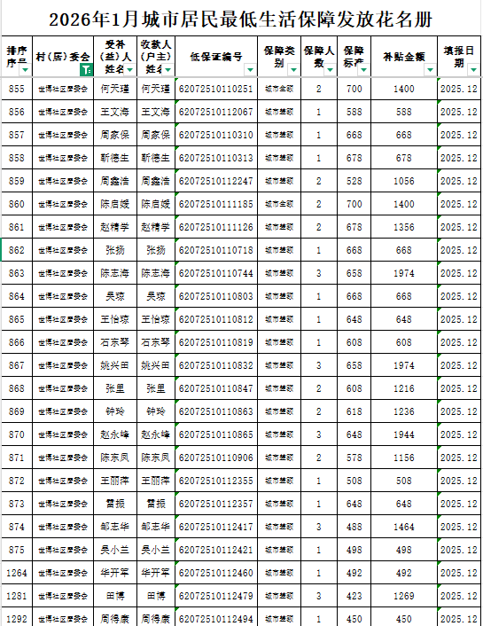 世博社区:2026年1月城市居民最低生活保障发放花名册