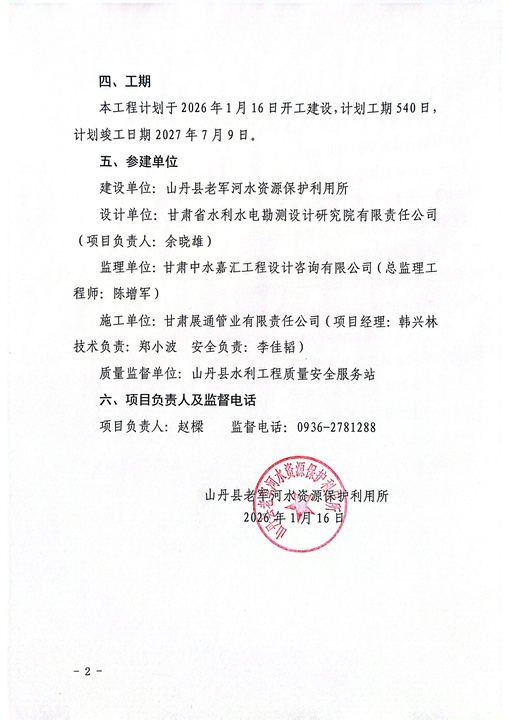 山丹县李桥水库至东乐水厂引水及供水保障工程开工公示