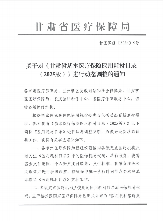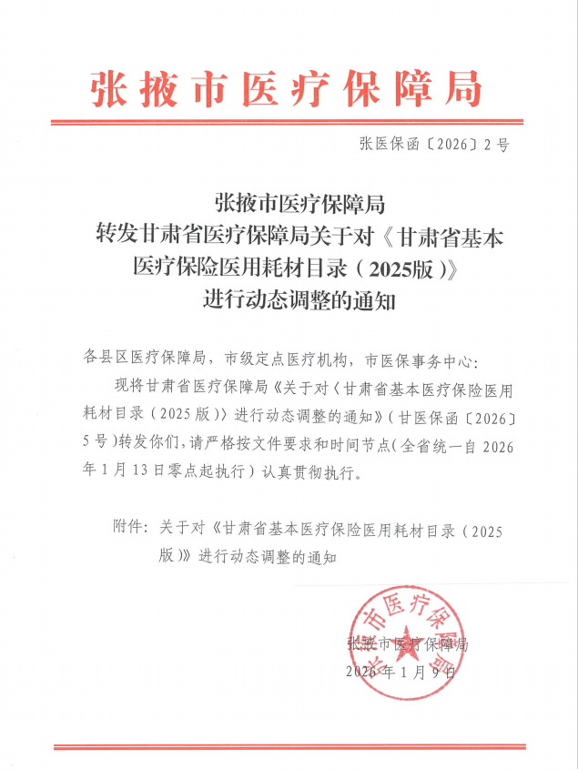 张掖市医疗保障局转发甘肃省医疗保障局关于对《甘肃省基本医疗保险医用耗材目录(2025版)》进行动态调整的通知