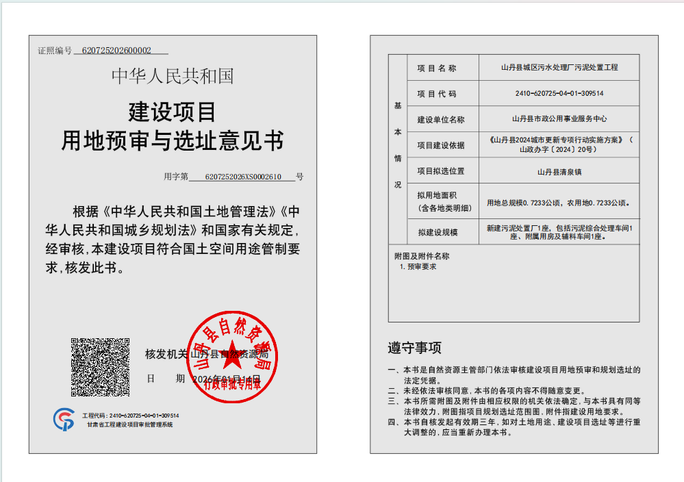 建设项目用地预审与选址意见书(山丹县城区污水处理厂污泥处理工程)