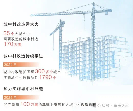 2024年,城中村改造扩围至300多个城市,实施城中村改造项目1790个。2025年,为持续用力推动房地产市场止跌回稳,住房城乡建设部将加力实施城中村和危旧房改造,推进货币化安置,计划在新增100万套城中村改造和危旧房改造的基础上继续扩大改造规模。