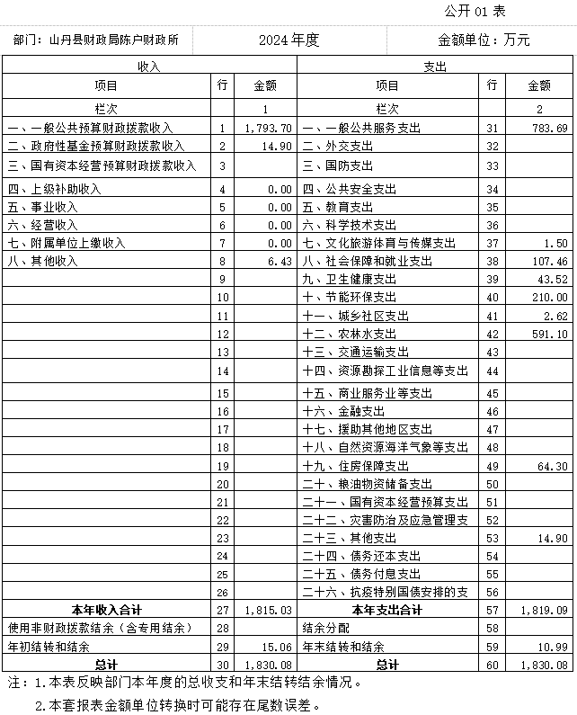 2024年度收、支总计均为1830.08万元。与上年度相比 ,收、支总计各减少678.55万元,下降27.05%,主要原因是主要原因是大额生态及地质灾害避险搬迁补助资金较上年减少。