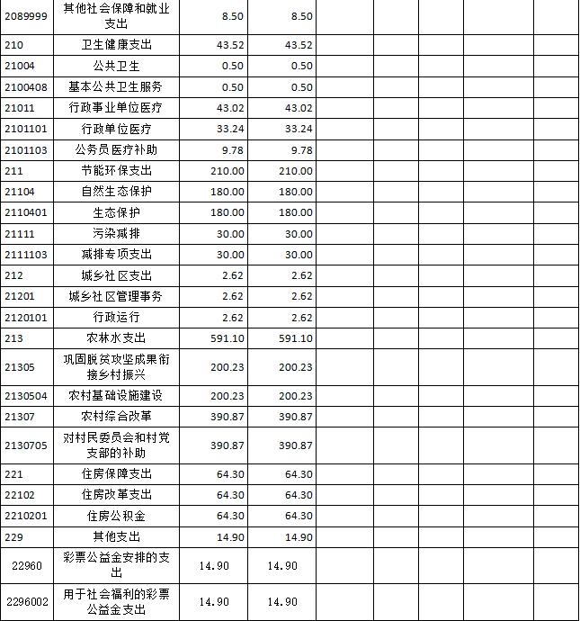 7.农林水支出年初预算数为401.06万元 ,支出决算为591.10万元 ,完成年初预算的147.38% ,决算数大于预算数的主要原因是拨入2022年度村级活动场所建设补助资金、风貌改造资金、及卫生改厕项目资金,村干部工资。