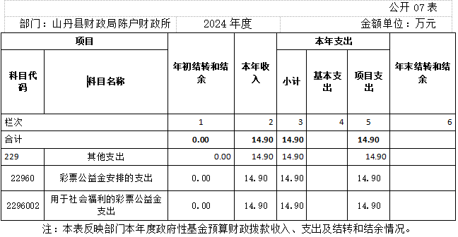2024年度政府性基金预算财政拨款年初结转和结余0.00万元 ,本年收入14.90万元 ,本年支出14.90万元 ,年末结转和结余0.00万元 ,支出具体情况如下支出陈户镇范营村互助幸福院维修改造项目10万元,支出西门互助院维修改造4.9万元。