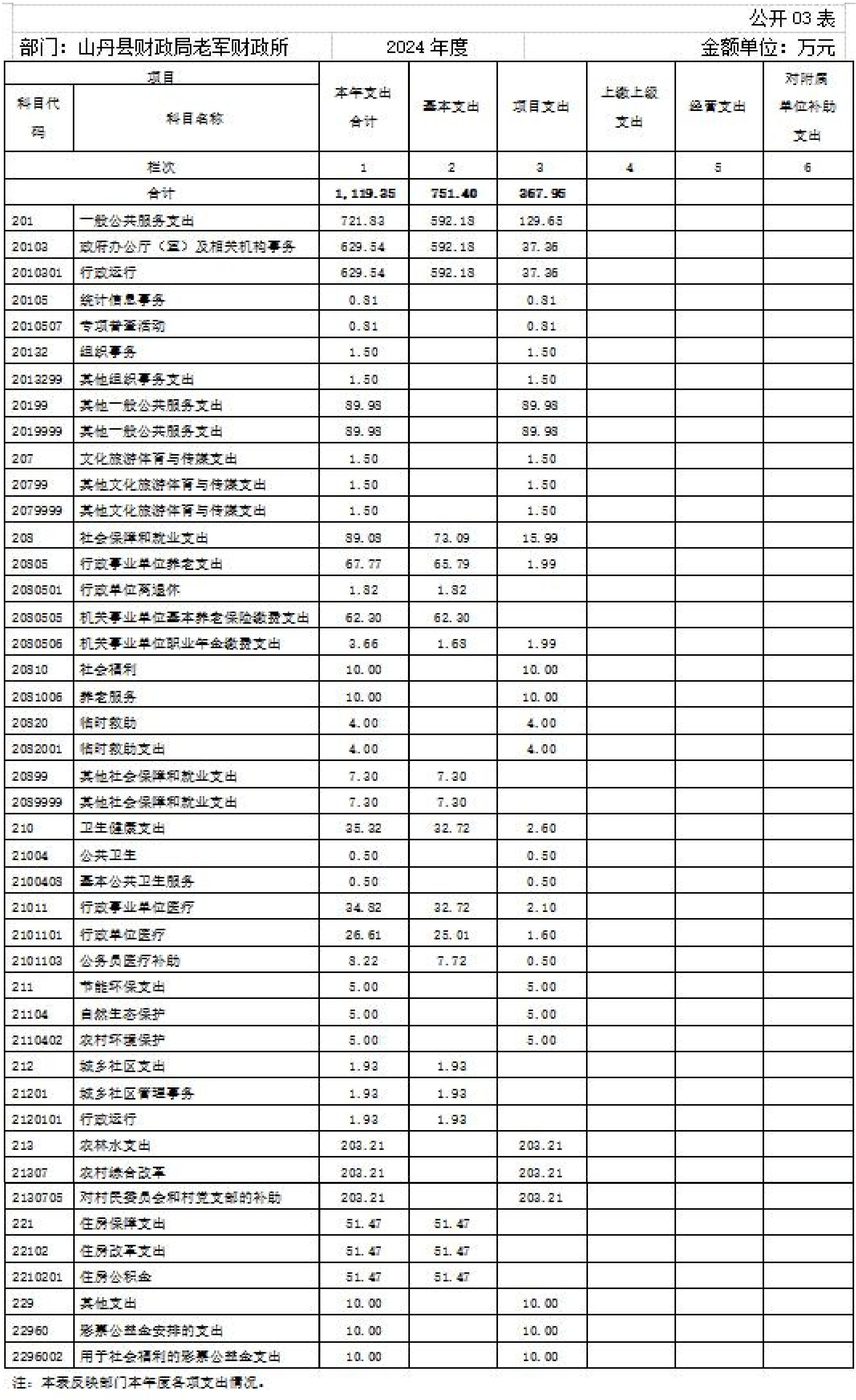 2024年度支出合计1119.35万元,其中:基本支出751.40万元,占67.13%;项目支出367.95万元,占32.87%。
