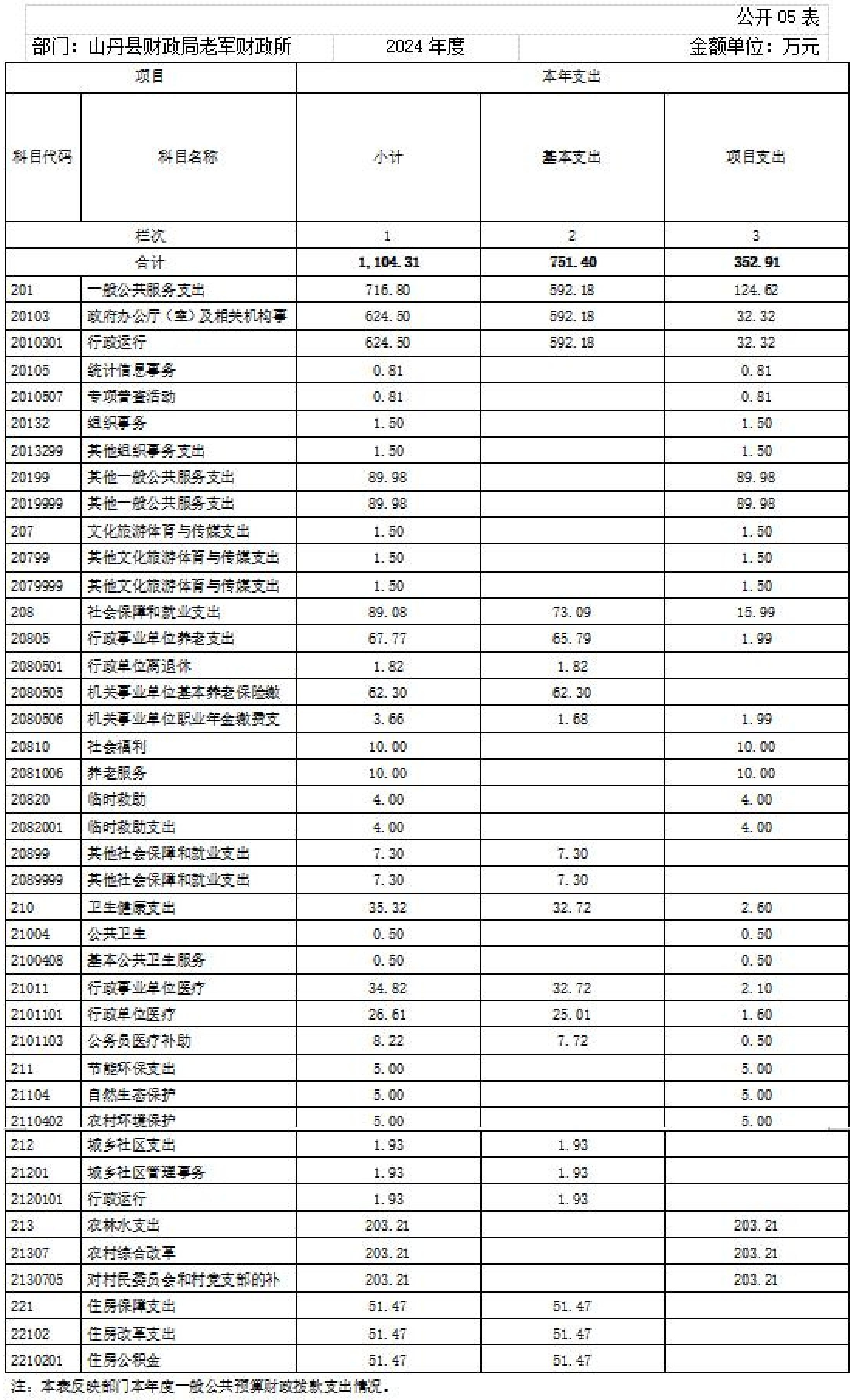 2024年度一般公共预算财政拨款支出1104.31万元,主要用于以下方面:一般公共服务支出716.80万元,占64.91%;文化旅游体育与传媒支出1.50万元,占0.14%;社会保障和就业支出89.08万元,占8.07%;卫生健康支出35.32万元,占3.20%;节能环保支出5.00万元,占0.45%;城乡社区支出1.93万元,占0.18%;农林水支出203.21万元,占18.40%;住房保障支出51.47万元,占4.66%。