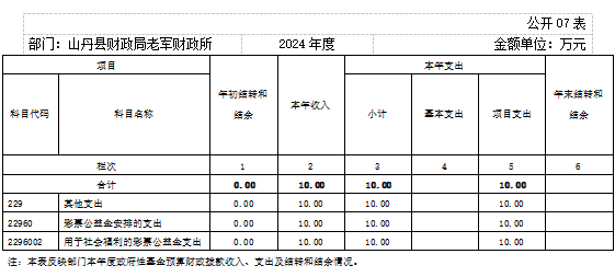 2024年度政府性基金预算财政拨款年初结转和结余0.00万元,本年收入10.00万元,本年支出10.00万元,年末结转和结余0.00万元,支出具体情况是老军村互助幸福院项目资金10.00万元。