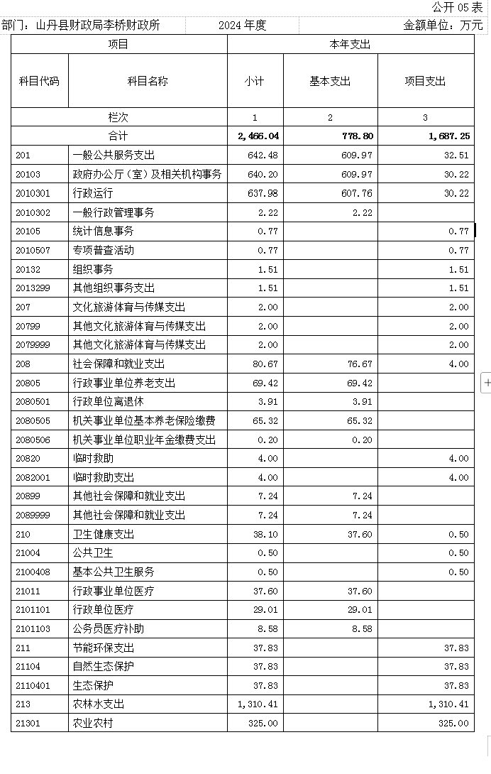 2024年度一般公共预算财政拨款支出2466.04万元,主要用于以下方面:一般公共服务支出642.48万元,占26.05%;外文化旅游体育与传媒支出2.00万元,占0.08%;社会保障和就业支出80.67万元,占3.27%;卫生健康支出38.10万元,占1.54%;节能环保支出37.83万元,占1.53%农林水支出1310.41万元,占53.14%;住房保障支出354.56万元,占14.38%.