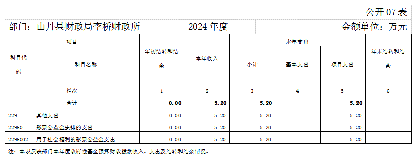 2024年度政府性基金预算财政拨款年初结转和结余0.00万元,本年收入5.20万元,本年支出5.20万元,年末结转和结余0.00万元,支出具体情况如下:村级互助幸福院省级补助资金,老年助残服务补助资金。