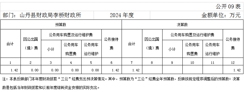 2024年度“三公”经费支出全年预算数为1.42万元,支出决算为1.42万元,决算数等于预算数的,较上年决算数减少0.83万元,下降36.72%,主要原因是逐年压减“三公”经费。