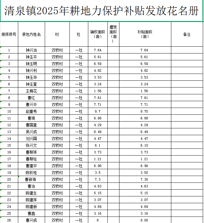 清泉镇2025年耕地力保护补贴发放花名册.xls
