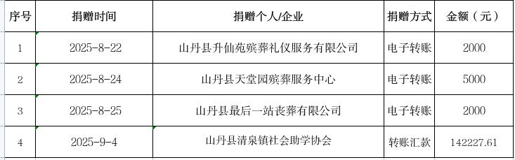 2025年山丹县慈善协会积极搭建爱心平台,得到广大爱心人士和爱心单位的积极响应,踊跃捐款捐物,现将(2025年8月21日——10月21日)接收到的银行转账收入公示如下: