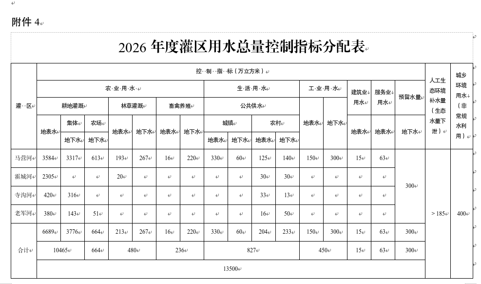 (二)灌区指标分配。按照“先地表水后地下水”的原则,合理配置年度取水量,全年用水总量控制指标13500万立方米【地表水7680万立方米、地下水5520万立方米、预留水量300万立方米】,其中:马营河灌区9393万立方米【地表水4476万立方米、地下水4917万立方米】,霍城河灌区2385万立方米【地表水2355万立方米、地下水30万立方米】,寺沟河灌区782万立方米【地表水453万立方米、地下水329万立方米】,老军河灌区640万立方米【地表水396万立方米、地下水244万立方米】,预留地下水水量300万立方米。(详见附件4)