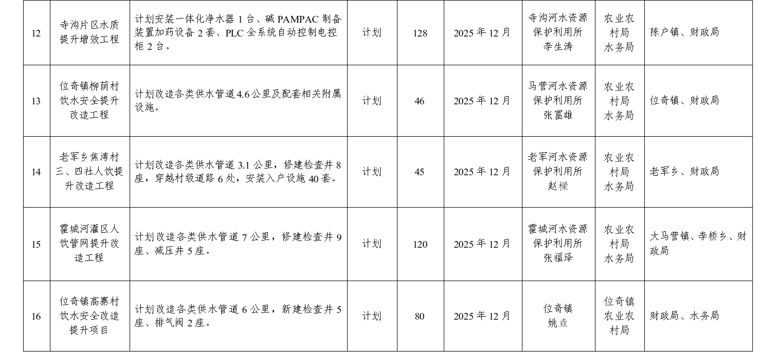 8.谋划实施农村人饮供水提升改造项目。积极争取乡村振兴衔接资金,谋划实施寺沟片区水质提升增效、老军乡羊虎沟村供水保障改造、位奇镇十里堡村农村人饮改造等13项农村人饮工程建设,计划完成改造各类供水管道69公里,全面提升全县5.04万人的饮水安全保障水平。