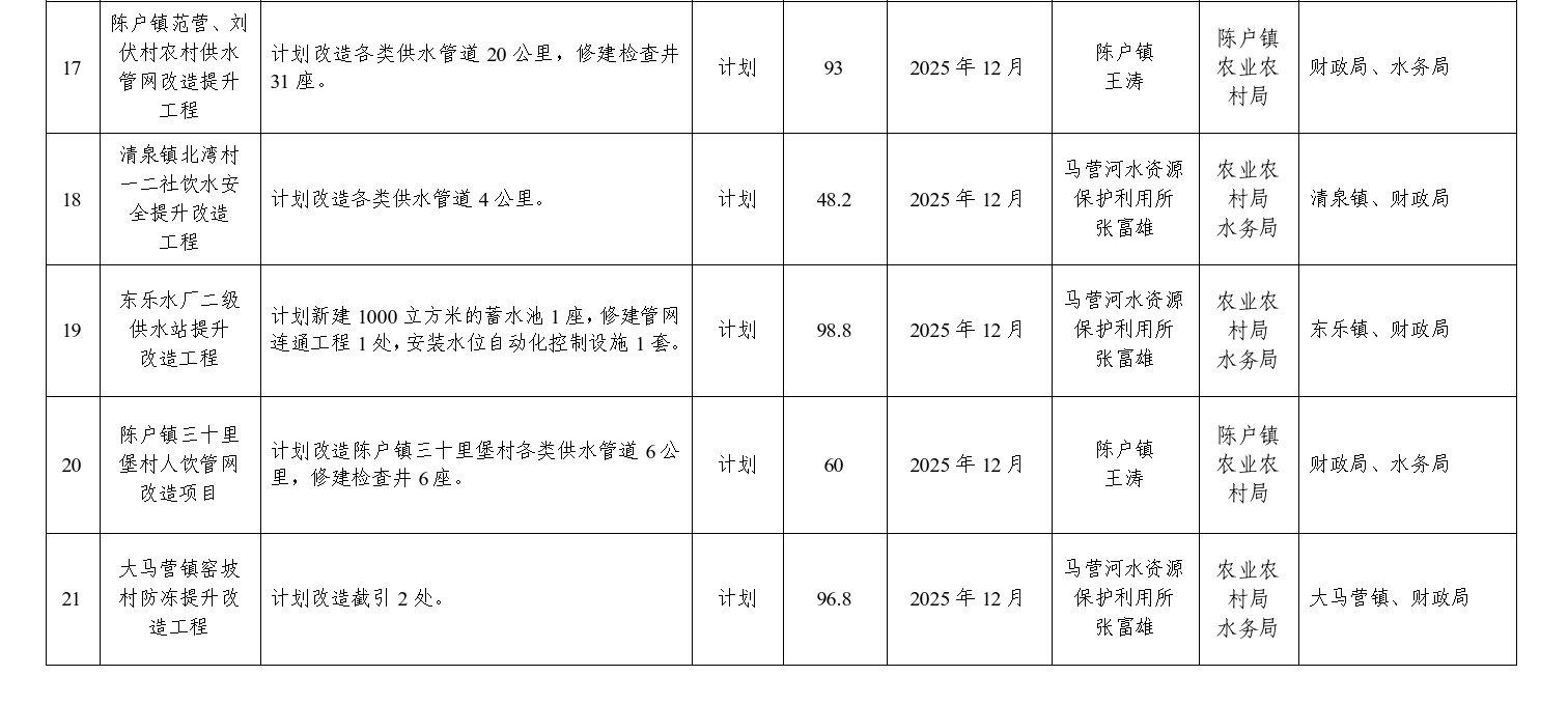7.扎实推动农村人饮维修改造工程。加快2025年农村人饮工程维修养护、山丹农场人饮提升改造等农村人饮项目建设,完成改造各类管道76公里,巩固提升全县3.5万人的饮水安全保障水平,逐步改善农村供水设施老化问题。