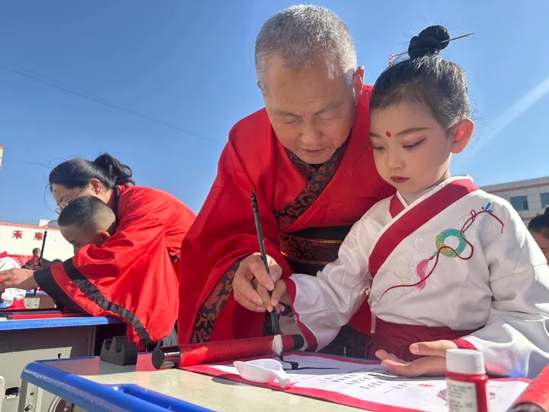 在“朱砂启智”的环节。老师们手持毛笔,轻点朱砂于每一位孩子的眉心,留下一颗鲜红的“智慧痣”,寓意“开启智慧,眼明心亮”。那一抹红,不仅是一种祝福,更是一种期许。仪式的高潮出现在“启蒙描红”环节。孩子们端坐案前,手握毛笔,在老师的示范下,一笔一画地书写出汉字——“人”。这一横一竖,不只是简单的笔画练习,更是人格塑造的开端。孩子们凝神静气,认真临摹,纸上的“人”字或许歪斜稚嫩,却承载着厚重的人生哲理。