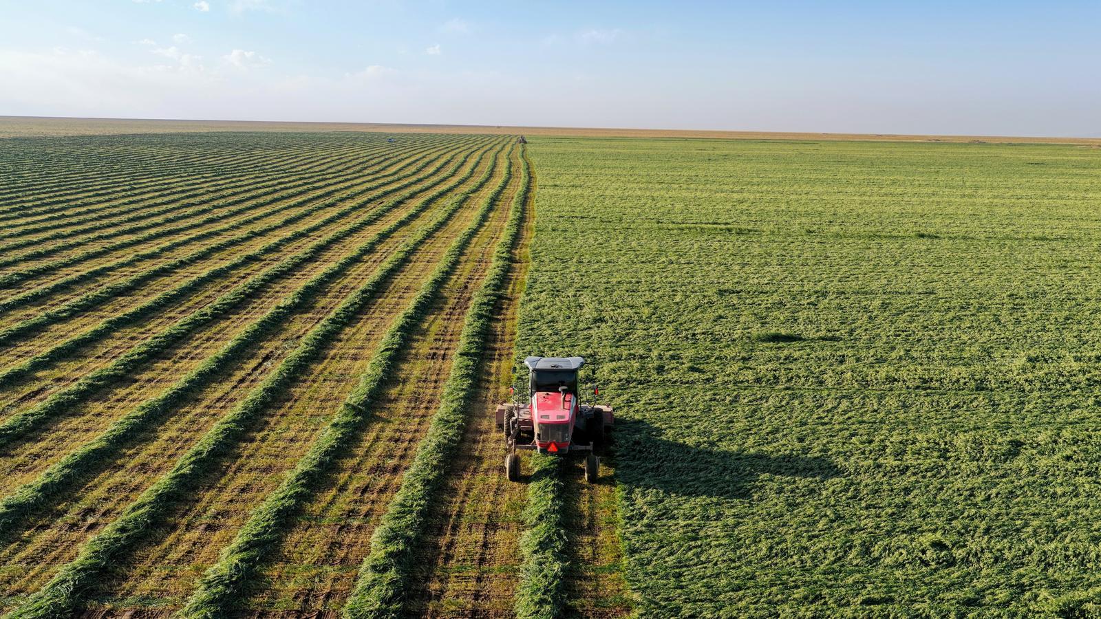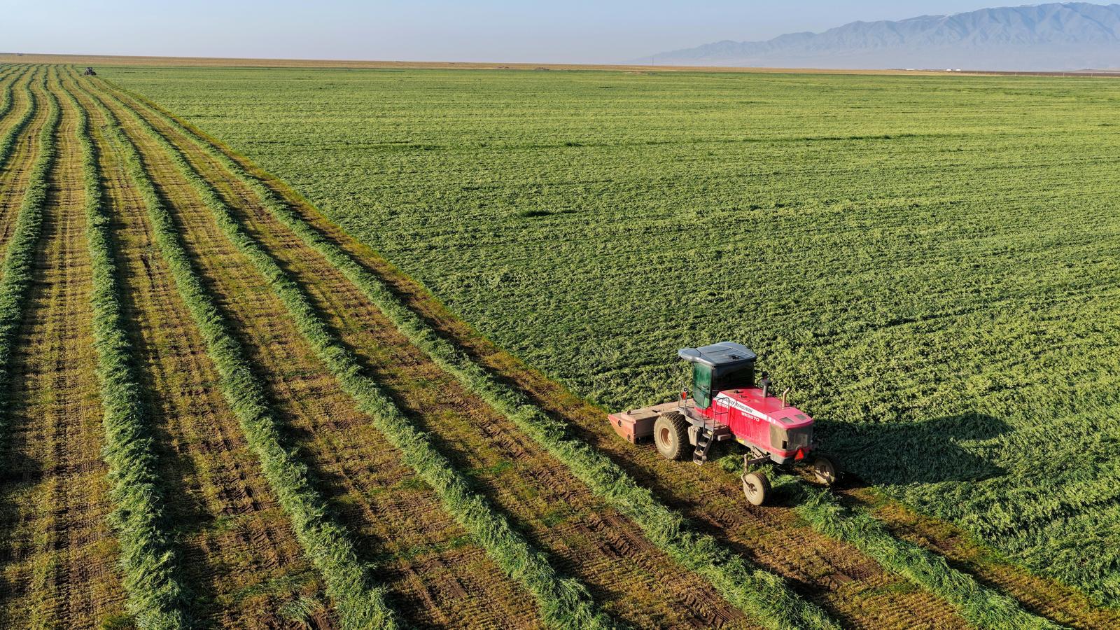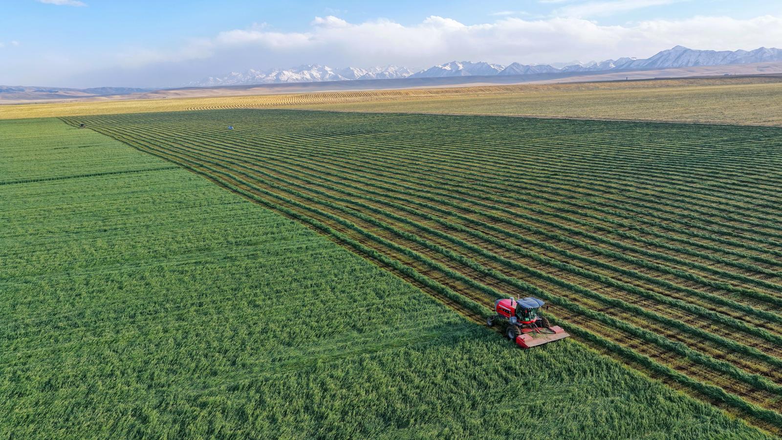 在广袤的田野上,大型割草机械轰鸣作响、往来穿梭,将连片长势喜人的燕麦草整齐割倒,拉开了今年燕麦草丰收的序幕,也在大地上勾勒出“机械为笔、草色为墨”的壮美丰收图景。