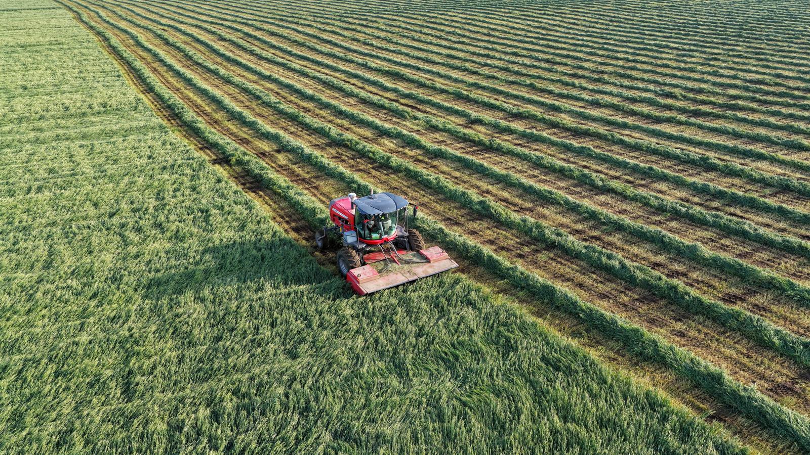 山丹马场坐拥广袤优质草场与耕地,近年来持续推进农业机械化升级,从种植到收割全环节广泛应用大型农机设备。收割现场,红色割草机如“钢铁画笔”,在葱郁的燕麦草海中辟出一道道规整的草垄;从空中俯瞰,绿色草甸与黄褐色收割带交错延展,农机穿梭其间,宛如在大地织就的天然锦缎上灵动跃动。