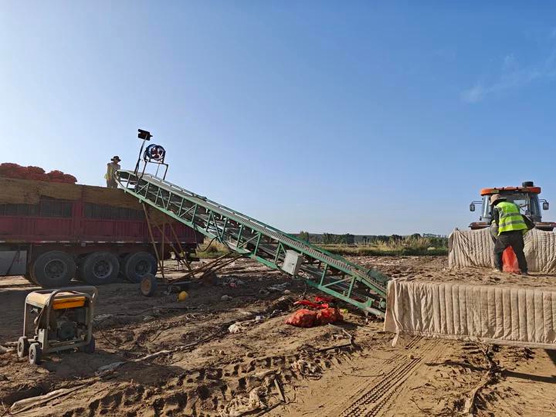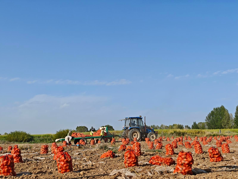 田边的运输区域同样一片繁忙,卡车的轰鸣声与田间的劳作声相互呼应。村民们两人一组,默契配合,搬运沉甸甸的马铃薯袋子。不到半小时,卡车货厢内就码出了棱角分明的“马铃薯方阵”,满满当当的车厢,承载着农户们一整年的希望与收获。