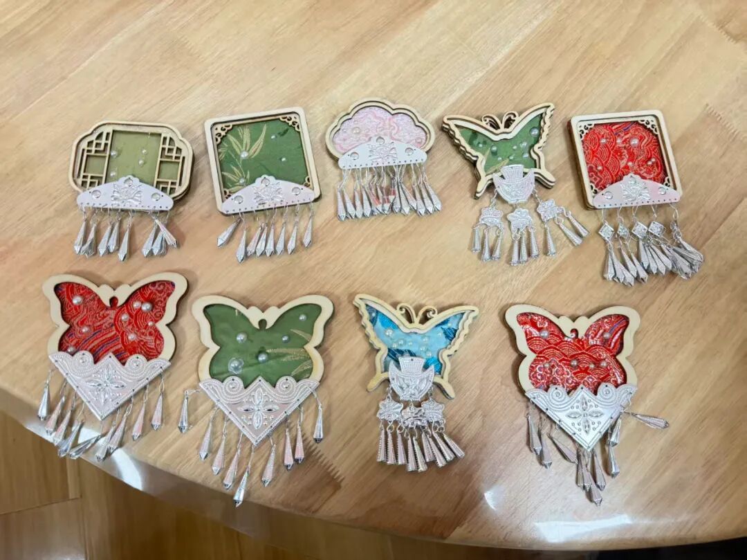 活动中,社教老师用动画和实物银饰,带孩子们读懂了苗银纹样里的“小秘密” 。了解了蝴蝶、牛角等纹样的寓意。在老师的指导下,制作出专属的形状、点缀上喜欢的挂饰,把课堂上听懂的苗银故事,做成了一枚枚能贴在冰箱上的“非遗小信物”。