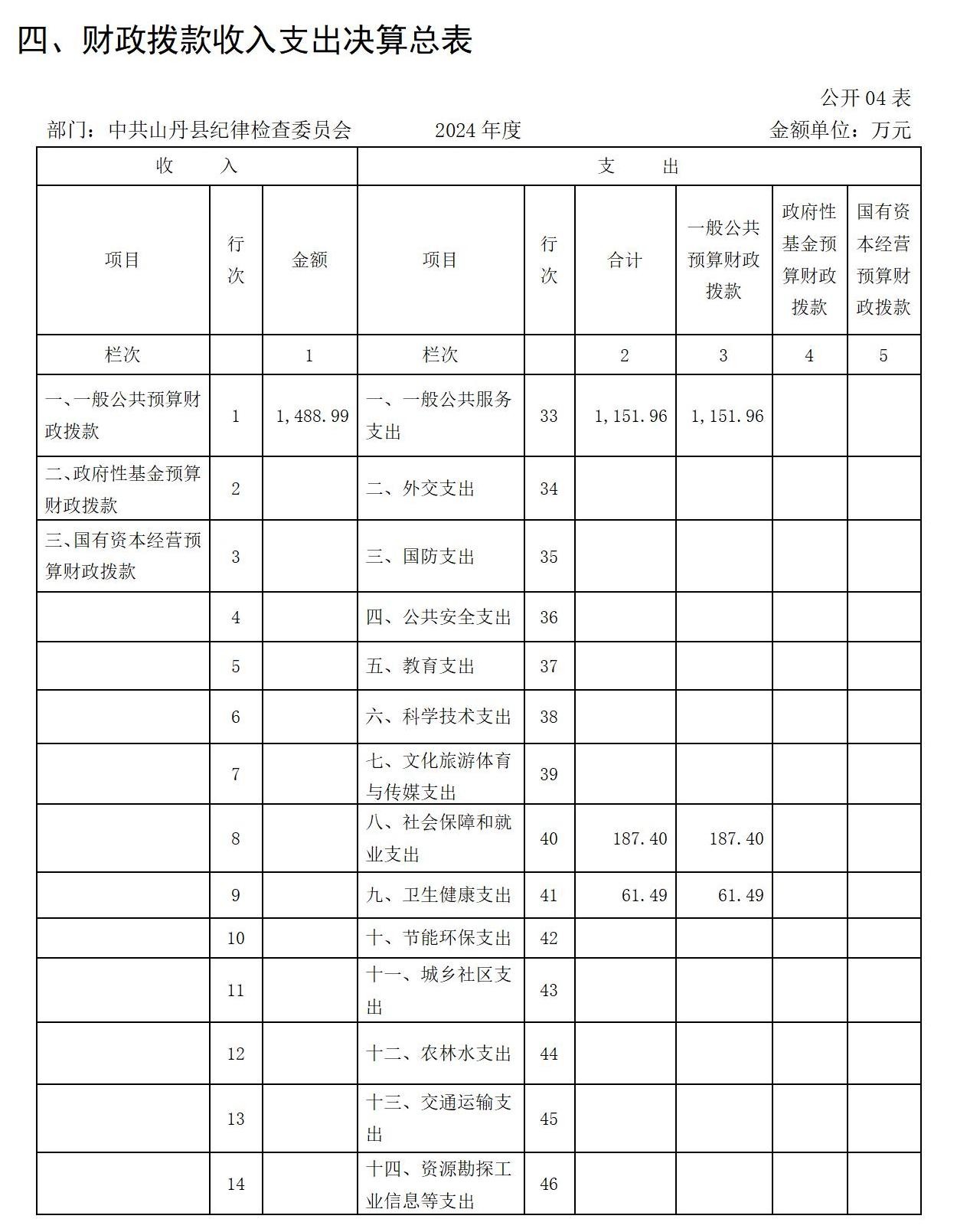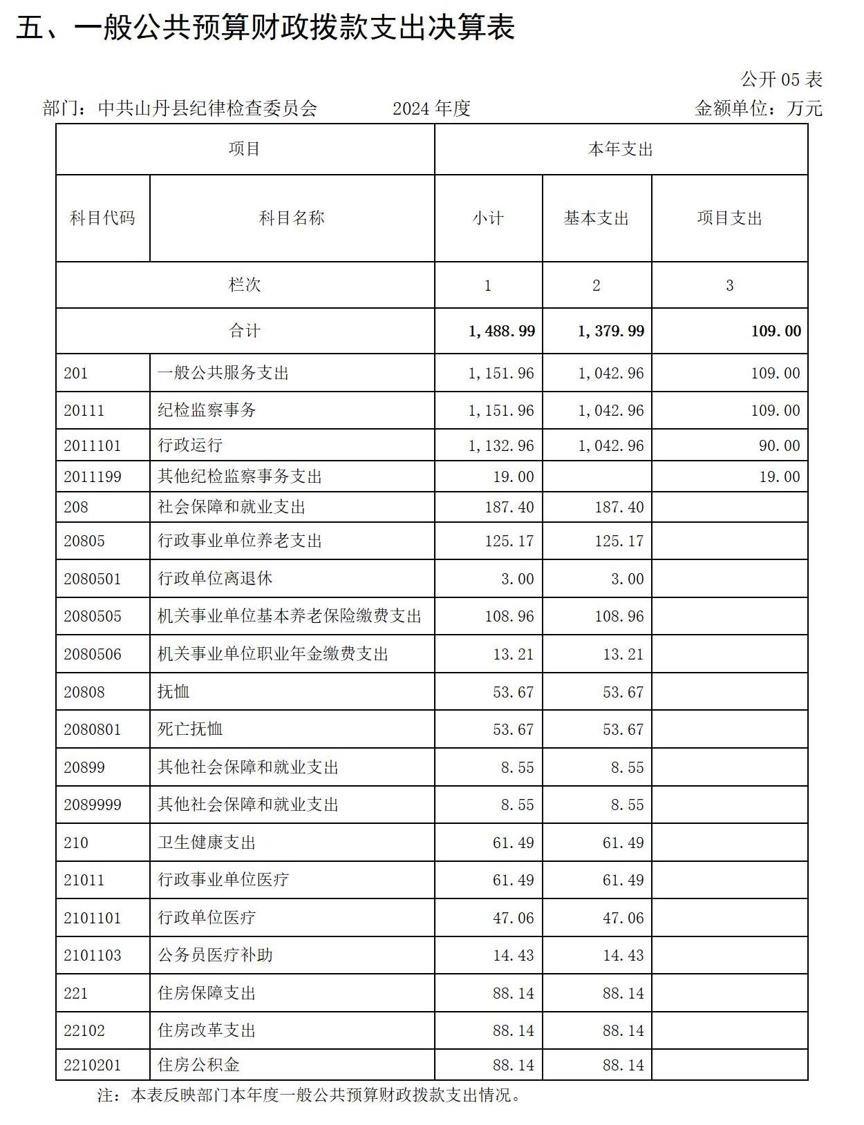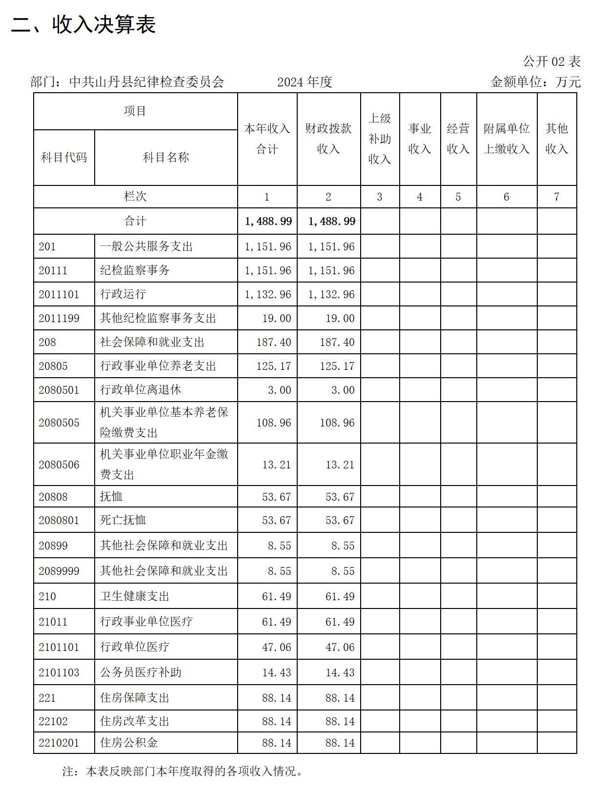 2024年度财政拨款收、支总计均为1488.99万元。与上年相比,各增加166.63万元,增长12.60%。主要原因是专案经费和中央纪检监察转移支付资金有所增加,相应全年财政拨款收入支出同时增加。