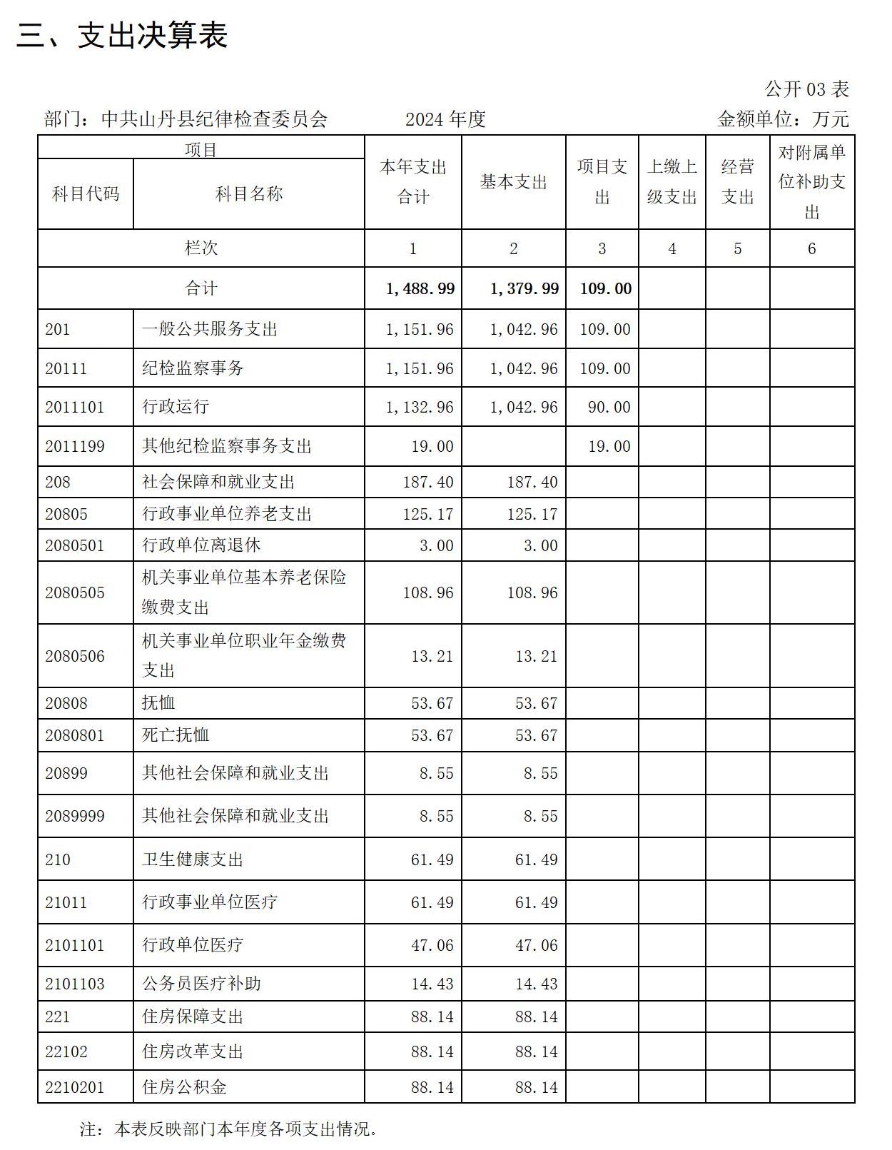 2024年度支出合计1488.99万元,其中:基本支出1379.99万元,占92.68%;项目支出109.00万元,占7.32%。