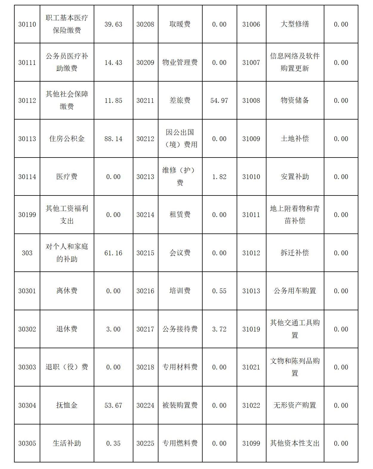 十九、社会保障和就业支出(类)残疾人事业(款)其他残疾人事业支出(项):反映除上述项目以外其他用于残疾人事业方面的支出。二十、社会保障和就业支出(类)其他社会保障和就业支出(款)其他社会保障和就业支出(项):反映除上述项目以外其他用于社会保障和就业方面的支出。二十一、卫生健康支出(类)行政事业单位医疗(款)行政单位医疗(项):反映财政部门安排的行政单位(包括实行公务员管理的事业单位)基本医疗保险缴费经费,未参加医疗保险的行政单位的公费医疗经费,按国家规定享受离休人员、红军老战士待遇人员的医疗经费。二十二、卫生健康支出(类)行政事业单位医疗(款)公务员医疗补助(项):反映财政部门安排的公务员医疗补助经费。