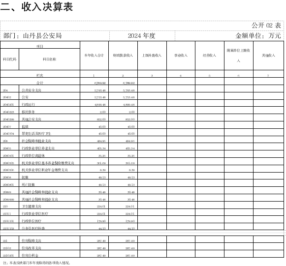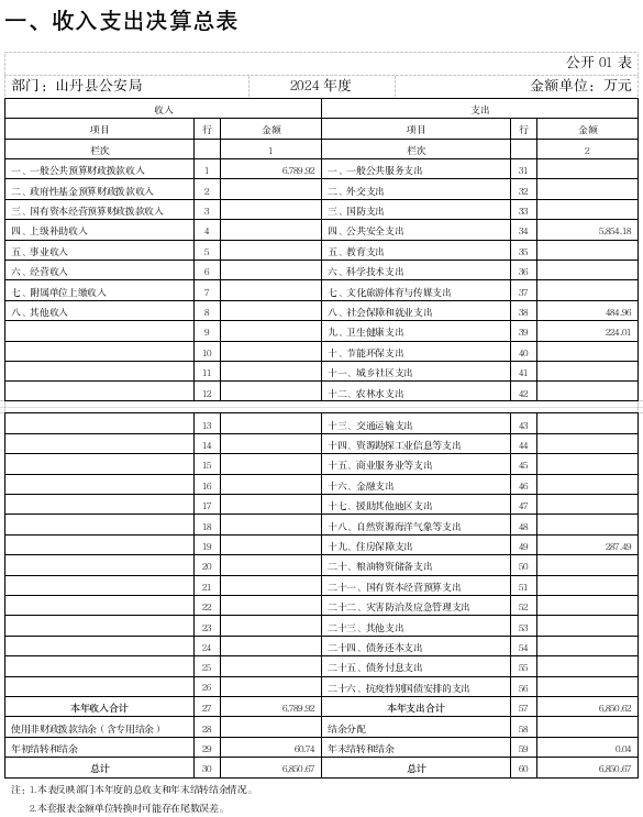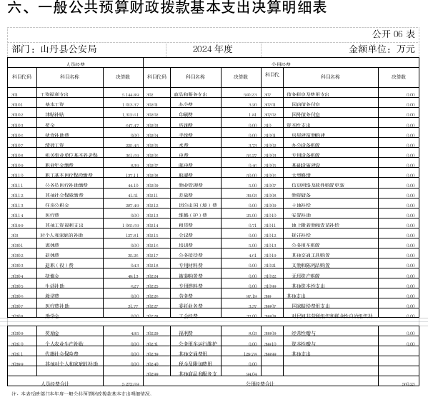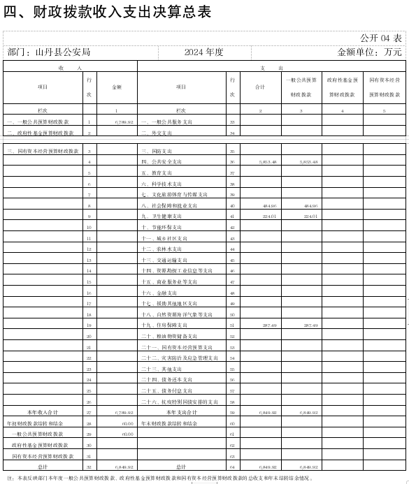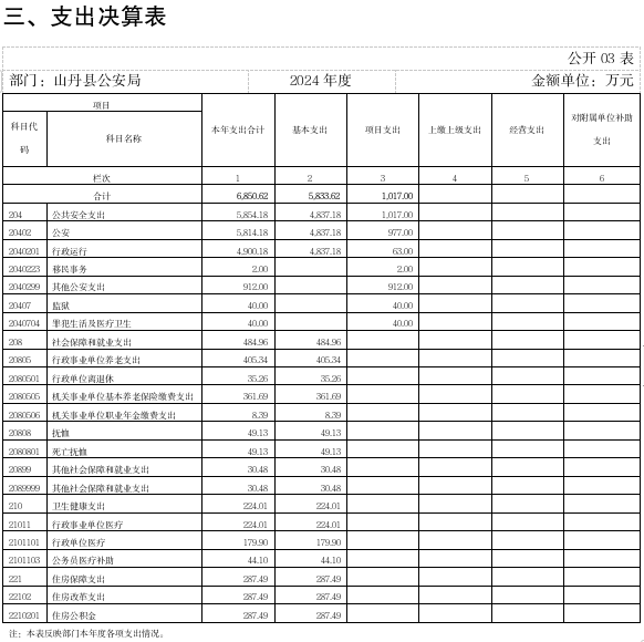 2024年度收、支总计均为6850.67万元。与上年度相比,收、支总计各增加515.98万元,增长8.15%,主要原因是年初结转公安专项资金50万元,武警中队执勤设备采购安装费10万元,由于人员新增、工资上涨等原因,人员经费、公用经费收入支出均增加,新增了陈户老军中心派出所工程款、营商服务奖励金等经费。