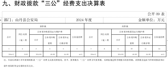 2024年度“三公”经费支出全年预算数为109.61万元,支出决算为109.61万元,决算数等于预算数的主要原因是年初预算时按照本单位当年需支出公务接待费、公务用车运行维护费、公务用车购置费情况进行详细预算。较上年决算数增加50.71万元,增长86.10%,主要原因是2024年新购入1辆执法执勤车、1辆囚车,公务用车购置费新增50万元,2024年年底出现冰雪天气进行应急执勤产生公务用车运行维护费由公安专项资金支付。