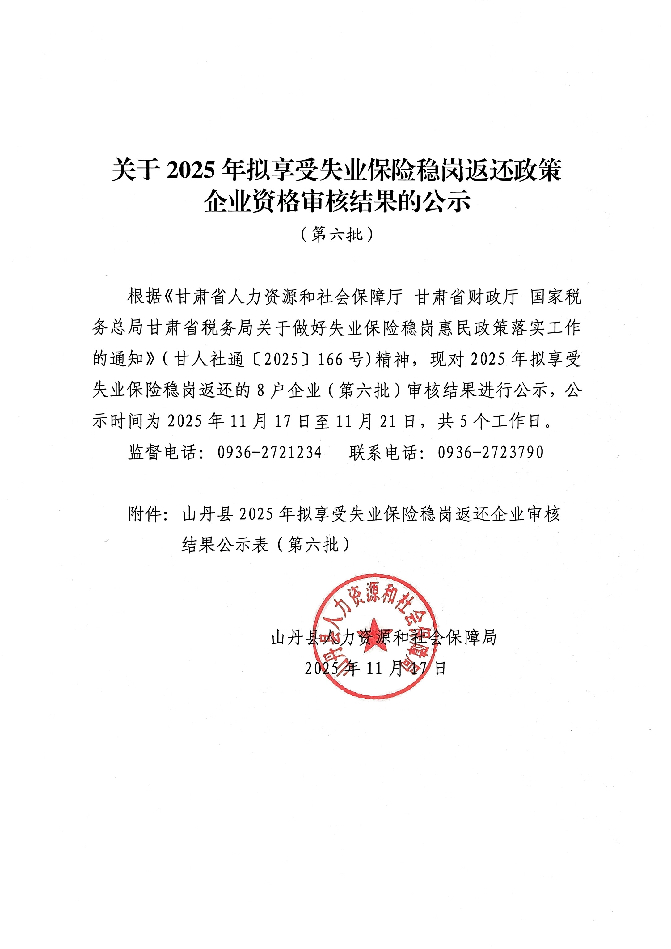 关于2025年拟享受失业保险稳岗返还政策企业资格审核结果的公示(第六批)