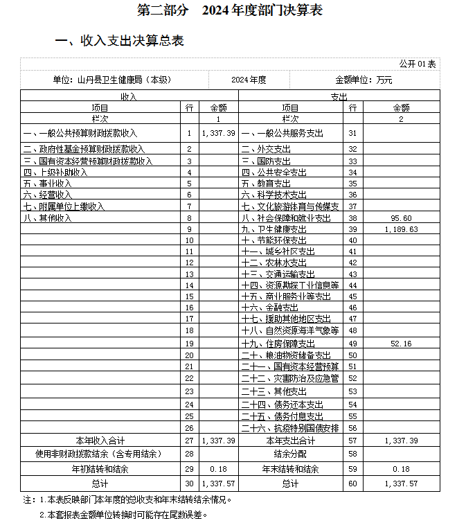 2024年度收、支总计均为1337.57万元。部门决算本年收入共计1337.57万元,年初结转和结余0.18万元;本年支出共计1337.57万元,年末结转和结余0.18万元。与上年度相比,收、支总计各减少816.04万元,下降37.89%,主要原因是2024年收入中疫情防控等相关项目经费减少,高龄补贴项目经费转至民政局。
