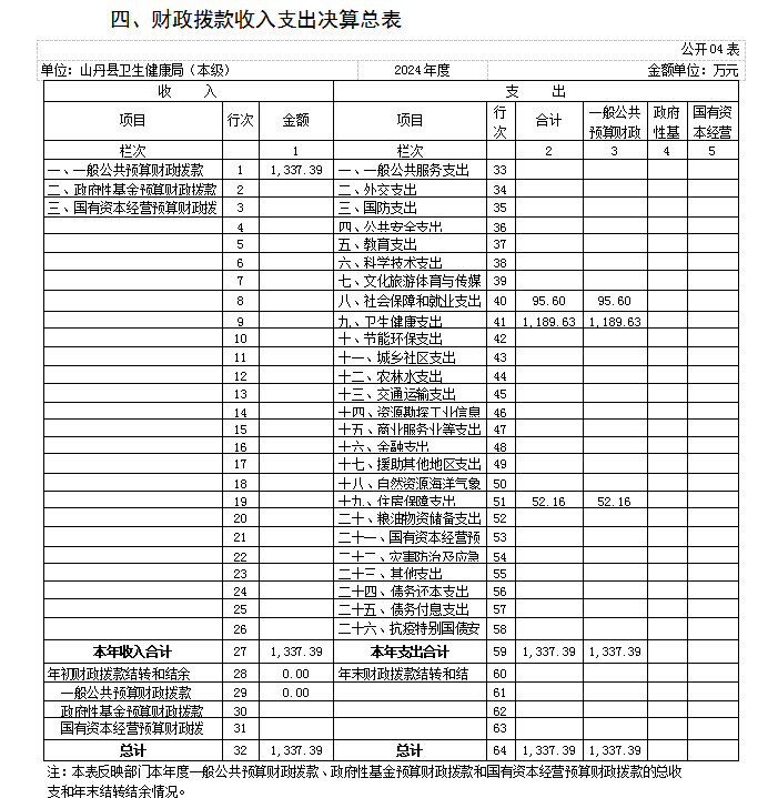 2024年度财政拨款收、支总计均为1337.39万元。与上年相比,各减少816.04万元,下降37.89%。2024年收入中疫情防控等相关项目经费减少,高龄补贴项目经费转至民政局。