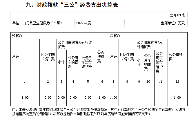 2024年度“三公”经费支出全年预算数为1.00万元,支出决算为1.00万元,决算数等于预算数,与上年持平。较上年决算数增加0.34万元,增长50.38%,主要原因是2024年我单位有招商引资工作。