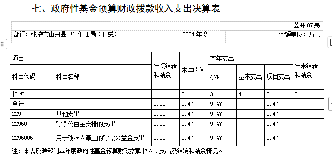2024年度政府性基金预算财政拨款年初结转和结余0.00万元,本年收入9.47万元,本年支出9.47万元,年末结转和结余0.00万元,主要用于残疾人事业的彩票公益金支出。