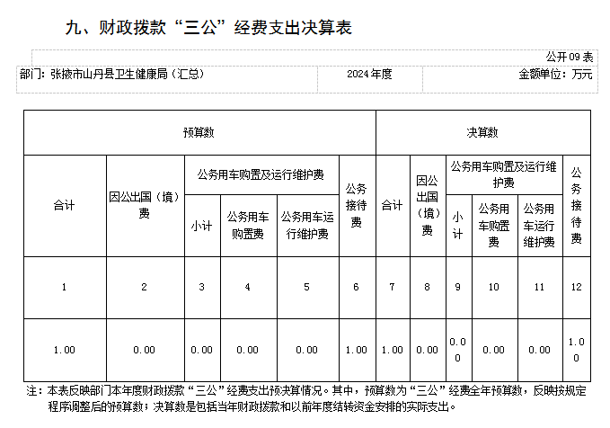 2024年度“三公”经费支出全年预算数为1.00万元,支出决算为1.00万元,决算数等于预算数。较上年决算数减少4.30万元,下降81.14%,主要原因是用于救护车出勤次数减少,用于燃料费、维修费、过路过桥费、保险费等支出减少。