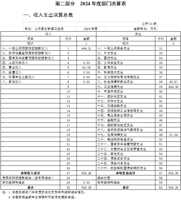 2024年度收、支总计均为506.29万元。年初结转结余0万元,年末结转和结余0万元。与上年度相比,收、支总计各减少3.84万元,下降0.75%,主要原因是新增退休人员1名,工资待遇由社保中心统发。