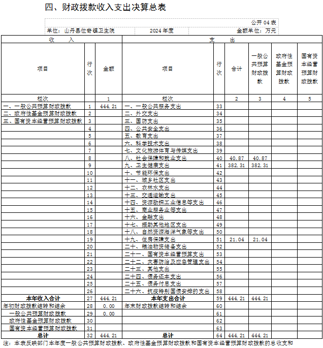 2024年度财政拨款收、支总计均为444.21万元。与上年相比,各增加0.07万元,增长0.02%。主要原因是人员增加和公共卫生经费增长。