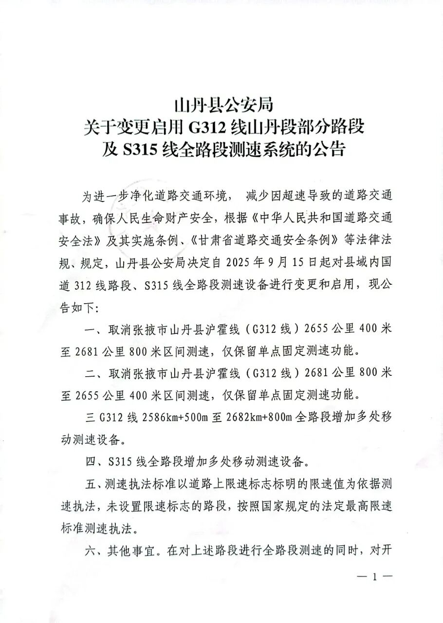 山丹县公安局关于变更启用G312线山丹段部分路段及S315线全路段测速系统的公告